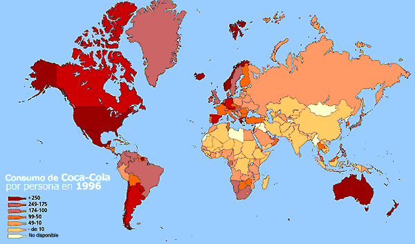 Con polémica o sin ella lo cierto es que Coca-cola es la bebida más consumida a lo largo y ancho de todo el planeta y su característico sabor dulce y con burbujas cautiva a todo el mundo sin distinción de clases, razas o religiones. A continuación una mapa orientativo del consumo de Coca-cola por persona en 1996.