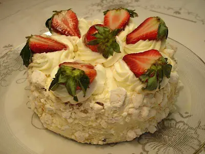 Antes de servir unte la torta con crema chantilly y péguele en los costados merengues picados que puede preparar caseros (la receta va otro día) o comprar ya listos como hice yo hoy, coloque también copos de merengue en la parte superior y encima de cada copo una media frutilla dándole una presentación artesanal. Si gusta puede salpicar con nueces o chocolate rallado en lugar de crema y frutillas, o dejar volar su imaginación con rodajas de kiwi, duraznos y crema.