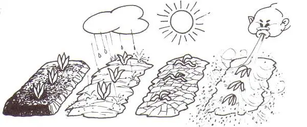 2) Los suelos desnudos también corren serios riesgos de desgastarse por efecto del impacto de las gotas de agua o del viento. Por ejemplo, una fuerte lluvia impactará sobre el suero, deshaciéndolo en partículas cada vez más pequeñas. Estas, al salir el sol y secarse, taponan la superficie de la tierra, formando "costras" que dificultan el crecimiento de las plantas. El viento, a su vez, actúa sobre el suelo desprotegido "barriendo" su capa superficial, que es precisamente la más valiosa.