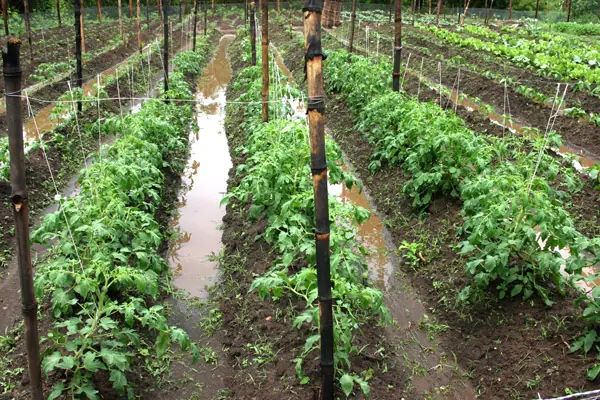 Las formas de riego variara según de que cultivo se trate o eventualmente de la edad de los mismos, por ejemplo usaremos el riego tipo lluvia (aspersión) o inundando surcos (inmersión); este ejemplo es apto para el tomate.
