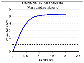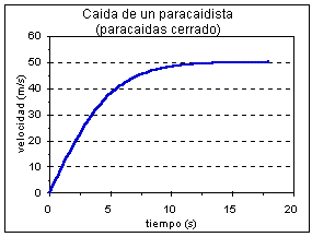 Con el paracaídas abierto en 2 s se alcanza la velocidad límite, mientras que con el paracaídas cerrado se necesitan unos 15 s.