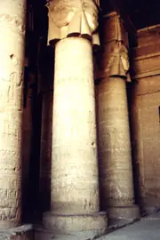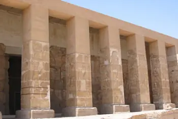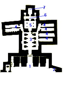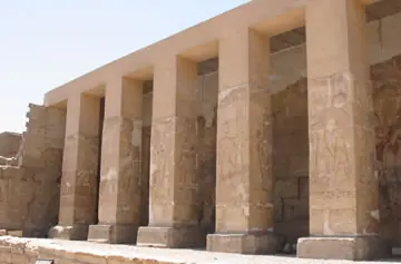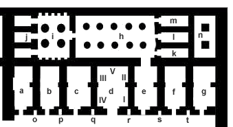 Segunda sala hipóstila (9) (plano 3). La sala hipóstila interior, que hace las funciones de vestíbulo a las siete capillas, esta sostenida por 36 columnas alineadas longitudinalmente con las de la sala exterior, para permitir el acceso directo a las capillas. Forman tres filas, las dos primeras en conjuntos de cuatro columnas, con capiteles papiriformes cerrados, agrupadas de dos en dos. En la tercera fila están rematadas por ábacos rectangulares sin capitel, con intención de reducir la diferencia de altura provocada por el desnivel del terreno.
