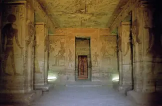 Después de la sala se abre el vestíbulo que da acceso al santuario, en el que se encuentra una representación de la diosa Hathor saliendo de la roca, entre 2 pilares osiríacos, además de las habituales escenas de ofrendas. A cada lado del vestíbulo aparecen 2 salas sin decoración, empleadas posiblemente como almacén de los objetos dedicados a las ceremonias religiosas.