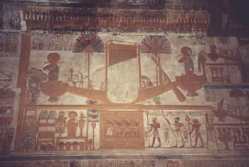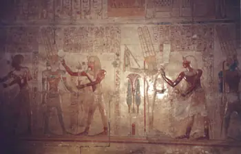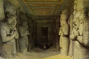 Las siete capillas (plano 4). Se puede acceder directamente por cada una de las siete puertas iniciales como continuación del pasillo a través de las dos salas hipóstilas. Cada una de las capillas está dividida, por pilastras (en las que aparecen grabados los títulos reales), en dos partes y podría contener la barca sagrada de cada uno de los seis dioses (excepto la correspondiente a Sethy I). Miden unos 11 x 5 m aproximadamente y contienen techos de falsa bóveda. Están policromadas las capillas de Amón-Ra (d) y Osiris (e). La decoración nos muestra al faraón celebrando diferentes ceremonias religiosas, relacionadas con los episodios rituales que se llevaban a cabo en las fiestas anuales, en las que se transportaban las imágenes de los dioses en la barca sagrada. Todas, excepto la de Sethy I que será descrita a continuación y en la que los relieves tratan de recalcar el reconocimiento soberano del rey por los dioses, mantienen una distribución similar de escenas. Comenzamos el recorrido por la parte derecha, avanzando en sentido inverso, según la numeración I-V de la capilla de Amón-Ra(*):