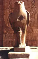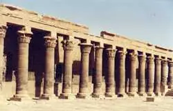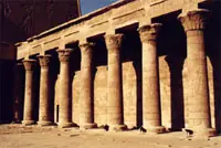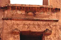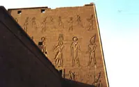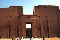 El templo de Edfú, dedicado al dios halcón Horus, fue comenzado el año 237 a. C. por Ptolomeo III Evérgetes I. En el año 212 a.C. se habían concluido las obras de la parte interior por Ptolomeo IV Filopátor, y se decoró en el 142 a.C. por Ptolomeo VIII Evérgetes II quien también terminó la primera sala hipóstila. Las obras en su totalidad no concluyeron hasta el 57 a.C con la colocación de las puertas.