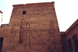 El templo de Isis se abre tras el dromos, como una construcción atípica, pues el recinto no es rectangular y los pilonos no son paralelos. Se accede a través del primer pilono, obra de Nectanebo I, de 45.5 metros de longitud y 18 de altura. En esta entrada monumental pueden verse escenas de matanzas de prisioneros dirigidas por Ptolomeo XII Neo Dioniso a las divinidades Horus, Isis y Hathor junto con cartuchos con el nombre de Nectanebo I. Tras el pilono de entrada al templo se encuentra un mammisi, compuesto por un pronaos y 3 cámaras, construido por Ptolomeo VIII Evergetes II y decorado por Neo Dioniso y Tiberio. Era el lugar de adoración de Isis, y está decorado con escenas relativas al nacimiento, infancia y educación de Hathor. Curiosamente en una de las paredes del pronaos se encuentra una reproducción en jeroglífico y demótico del decreto de la piedra de Rosetta.