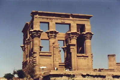 Situado originalmente en la isla de File el recinto en el que se encuentra el Templo de Isis se abre con un embarcadero y el pabellón de Nectanebo I a la izquierda, con un pórtico rectangular formado por 14 columnas campaniformes con ábaco hatórico dispuestas en 2 filas simétricas respecto a la edificación. A la derecha se encontraba el Templo de Arensnufis, dios nubio, construido por Ptolomeo IV Filopátor y el rey nubio Ergamene. En este punto estaba situado el dromos, con 2 pórticos uno al oeste, formado por 32 columnas con capiteles mixtos y otro al este, edificado por el emperador Augusto. La decoración de los pórticos incluye escenas de ofrendas y cartuchos con los nombres de los emperadores Augusto, Claudio, Tiberio, Calígula y Nerón. Junto al pórtico este se encontraba el Templo de Imhotep, funcionario divinizado del faraón Dyeser, encargado de la construcción de la primera pirámide, la pirámide escalonada de Saqqara.