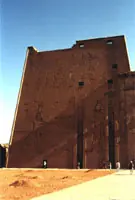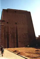 El pilono. Las 2 torres del pilono se dividen en 4 pisos con cámaras, unidas por una escalera de 145 peldaños. Están decoradas con imágenes de Ptolomeo XII Neo Dioniso sacrificando prisioneros ante Horus y Hathor, precedidas de 2 halcones realizados en granito negro.