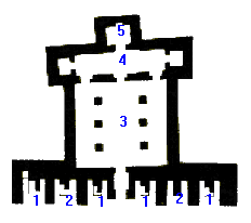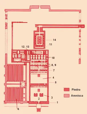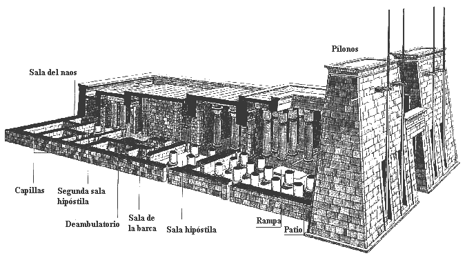 El modelo básico estaba constituido por 3 zonas claramente diferenciadas; el patio, la sala hipóstila y las dependencias del dios, además de la entrada, el pilono.