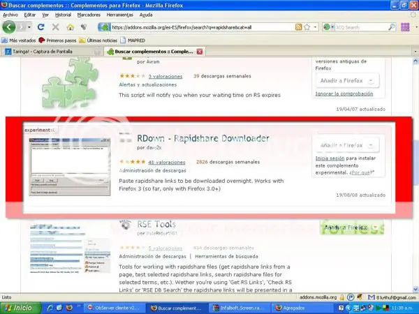 Es por eso que me puse a urgar en los complementos para Firefox 3.0, y encontré el "RDow - RapidShare Downloader". Una utilidad maravillosa para mí.
