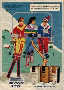 En la imagen podemos ver a dos hombres y una mujer. Ella esta sentada entre los dos hombres, pero tiene algo que ver con el hombre de la izquierda, porque este tiene su mano en su hombro, así que podemos deducir que lo más seguro es que sean pareja. Pero ella a quien pone atención es al otro hombre, al que esta fumando. Ahora veamos como el hombre de la derecha penetra a la mujer con el esquí izquierdo, mientras que el otro va directo a la cajetilla de cigarros, estableciéndose la relación entre la infidelidad y los cigarros. Y ya para finalizar, podemos ver como el hombre de la derecha viste con los colores de la bandera de los Estados Unidos, mientras que el de la izquierda o el perdedor, usa los colores de los comunistas.