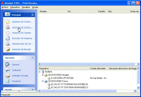 Iniciamos el Alcohol 120% y nos aparece una pantalla inicial con todas las opciones que podemos realizar con él.