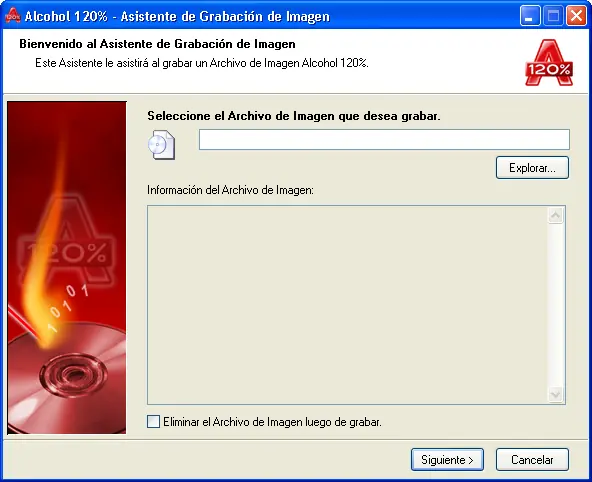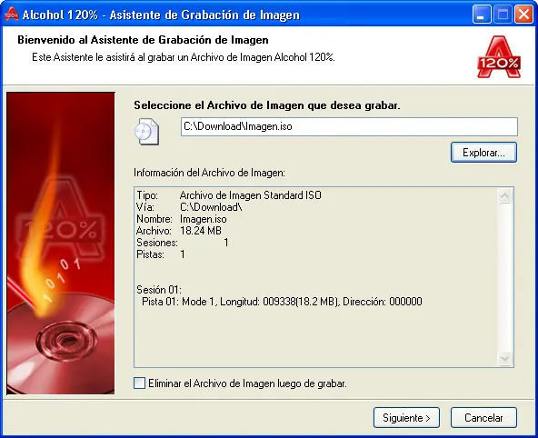 Una vez hemos elegido la imagen iso que queremos grabar el Alcohol 120% nos muestra la información de la imagen que vas a grabar.