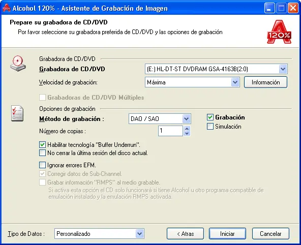 Pulsamos en Siguiente y nos aparece una pantalla donde podemos elegir la grabadora con la que queremos realizar la copia, velocidad de grabación y el tipo de Datos,etc.