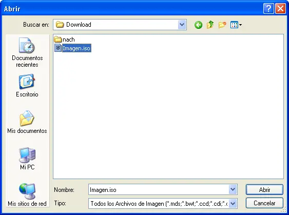 En este caso lo que queremos es copiar la imagen ISO que nos hemos descargado de Internet. El Alcohol 120% reconoce las siguientes extensiones de imágenes ISO: .mds .bwt .ccd .cdi .cue .pdi .nrg .iso