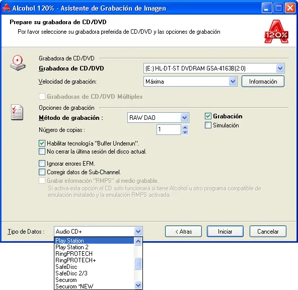 Una opción importante de esta pantalla es la de Tipo de Datos (donde pondremos Playstation 2) ,el Metodo de Grabacion debe ser DAO o RAW DAO (los dos son la misma cosa), la velocidad de Grabacion (debe ser 4.0x).