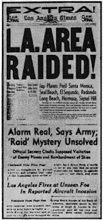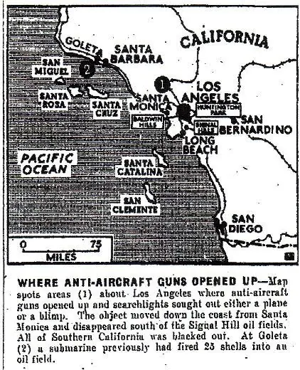 A las siete de la tarde del 24 de febrero de 1942 se detectó en la costa californiana la presencia de unas extrañas luces parpadeantes, por lo que saltó la alarma en los puestos de defensa costera, ante la posibilidad de que se tratase de aviones japoneses. Aunque desaparecieron al cabo de unos minutos, el estado de alerta duró hasta las diez y media de la noche,sin que se volviera a tener noticia de las luces.