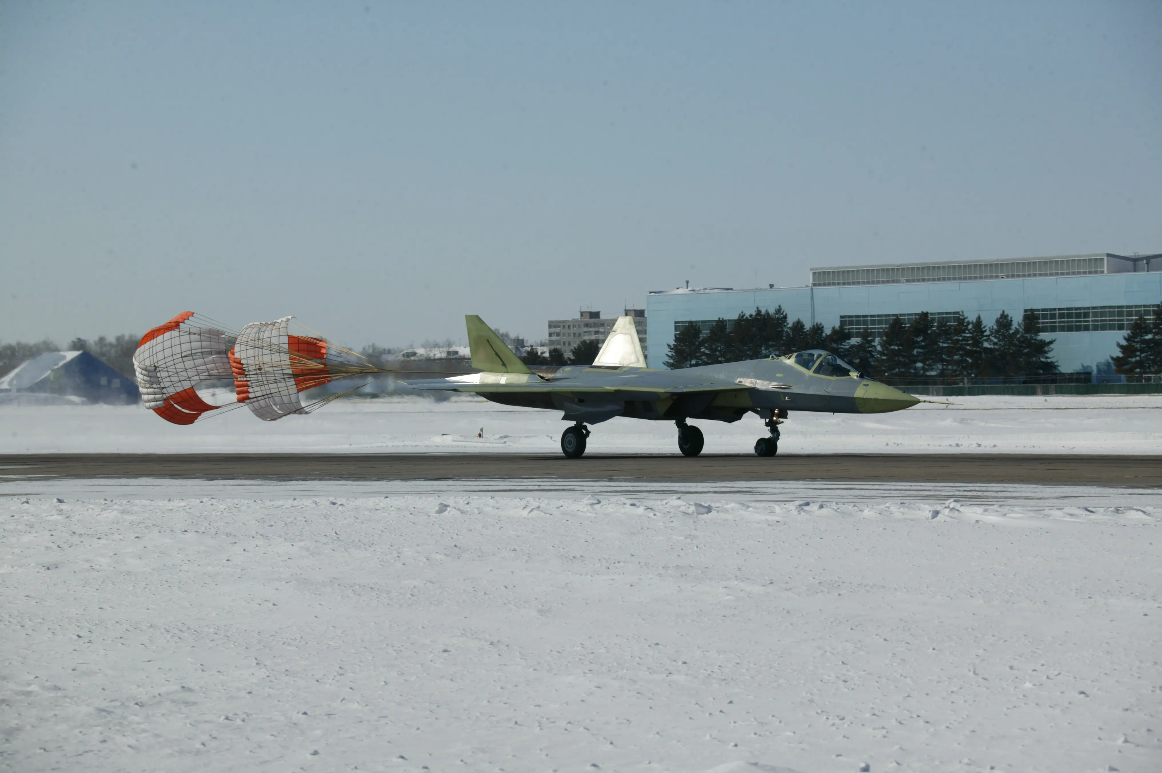 El T-50-1 aterriza desplegando un paracaídas de frenado.
