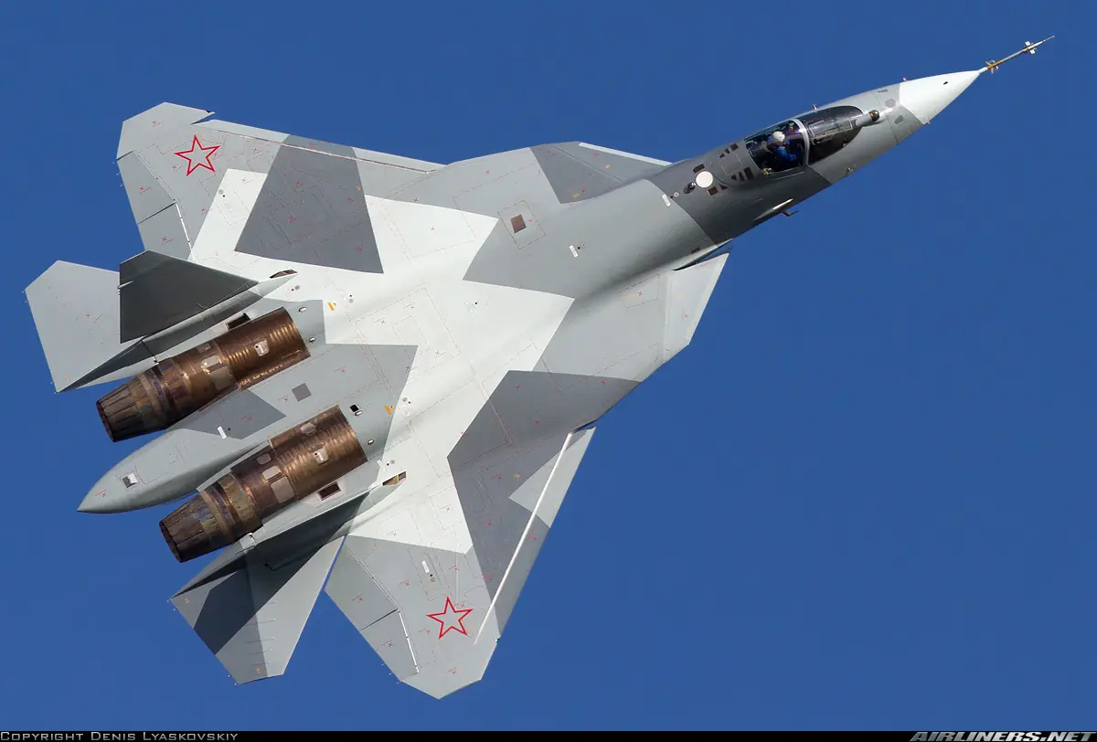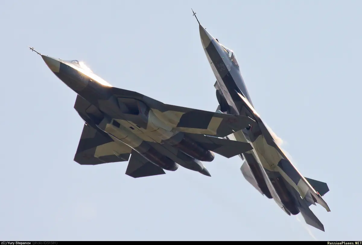 El T-50 muestra un avanzado diseño con características de diseño furtivo.