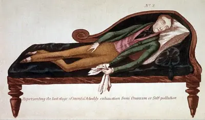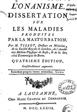 En el siglo XVIII hace su aparición el nefasto médico Samuel August Tissot, con un libro publicado en 1760 que debió haber sido quemado. De ese pafleto se editaron cientos de ediciones que fueron leídas desde Voltaire y Rousseau hasta los fundadores de los Estados Unidos, en el que se difundían los más horripilantes mitos acerca de la masturbación y del síndrome "post-masturbatorio". Europa y Norteamérica se empaparon de las advertencias que hacía Tissot sobre la masturbación y curiosamente fue publicado hasta bien entrado el siglo XX, logrando crear un temor casi universal. En su tratado Tissot ilustra una anécdota de un hombre, que según el autor, había recibido tratamiento tardío para la terrorífica enfermedad: