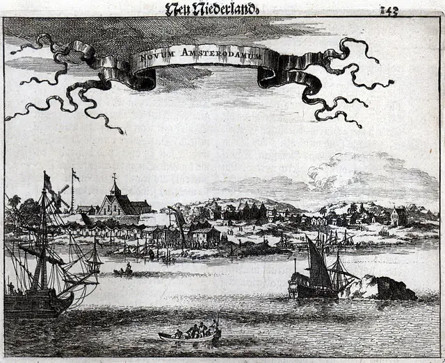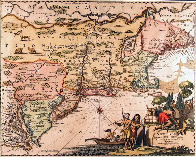 JGiovanni da Verrazzano descubrió la zona de Nueva York. En 1624 la compañía de las indias occidentales fundó la villa holandesa de Nueva Amsterdam (Nieuw Amsterdam) en el extremo sur de Manhattan. Peter Minuit, primer gobernador de la colonia, compra la isla a la tribu india de los Canarsie en 1626 e instala en ella colonos flamencos y valones. En 1664, barcos Ingleses capturaron la ciudad sin enfrentamiento, y fue rebautizada como Nueva York en honor del Duque de York. Al final de la Segunda Guerra Anglo-holandesa en 1667, por el Tratado de Breda, los holandeses entregaron Nueva York formalmente a los ingleses y recibieron, como contraparte, la colonia de Surinam.