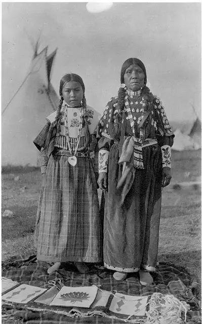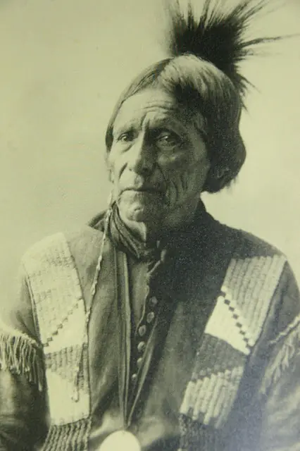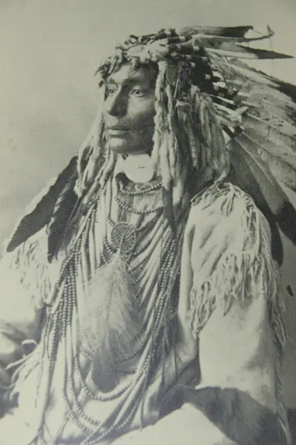 Caballo Moteado de Caza, gran guerrero assiniboin en 1898. Luce un tocado de plumas de águila, adorno tradicional; en este caso las plumas están colocadas hacia atrás con el fin de cubrir la cabeza.