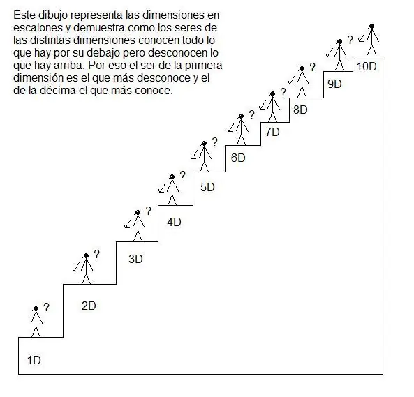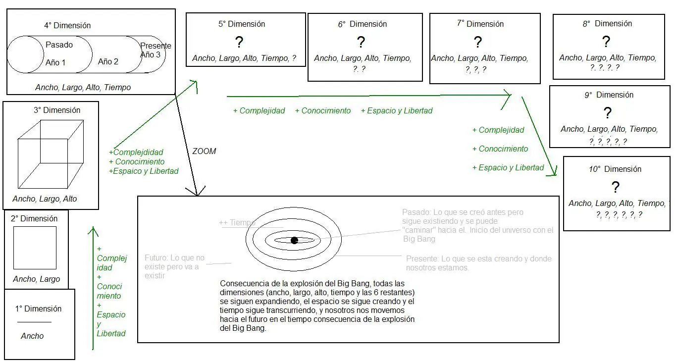 Entonces ahora podemos notar algo clave para entender la cuarta dimensión. Este circulito que vive en 2 dimensiones, tiene en cuenta a la tercera dimensión como "otro mundo" el alto es "otro mundo paralelo". Una entidad que viva en 1 dimension también verá al largo como "otro mundo" y al alto como "otro mundo mas". Porque ese "otro mundo" es lo que llamamos a lo que desconocemos, a lo que no vemos porque no fuimos preparados para hacerlo. Es por eso que nosotros vemos a la cuarta dimension y a las 6 restantes como "otros mundos paralelos", pero alguien que vive en la cuarta dimensión vería: ancho, largo, alto y tiempo. Si, asi es, la cuarta dimensión es el tiempo y ahora vamos a explicarlo pero quiero que quede claro esto de los mundos. Un ser de 4 dimensiones va a ver a la quinta dimension como otro mundo porque lo desconoce. El de la sexta le va a suceder lo mismo con la séptima y así sucesivamente hasta llegar a la última dimensión, la décima, porque existen 10 dimensiones. Esa entidad que vive en la décima dimensión lo sabe todo, no desconoce nada y puede ver todo.