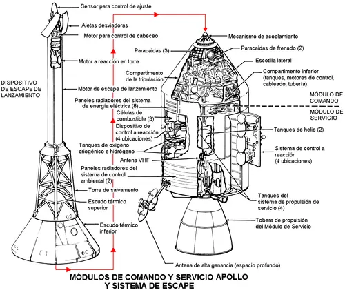 Modulo de Comando y Servicio:tenía espacio para una tripulación de 3 astronautas y estaba fijado al módulo de servicio que proveía de abastecimiento y contenía el motor del sistema de propulsión de servicio que ubicaba a la nave dentro y fuera de la órbita lunar.