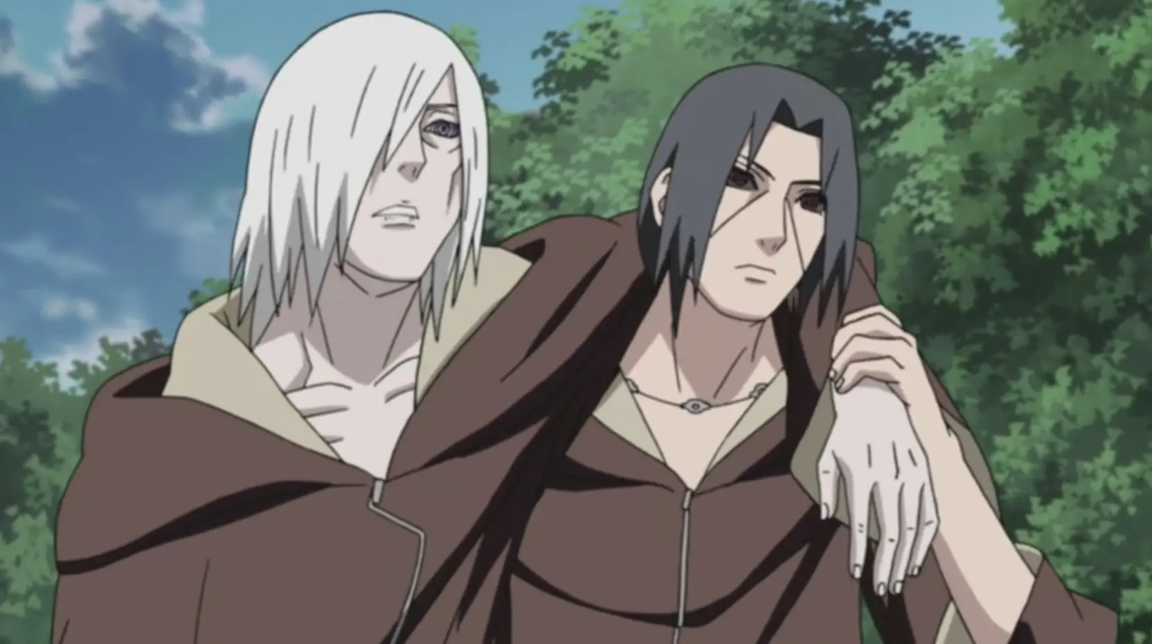 Kabuto lanza su Arte Sabio: Jutsu Blanco Violento, que anula la visión y oído de Itachi y Sasuke, entonces Kabuto aprovecha para atacar a Sasuke, que es protegido por el Susanoo de Itachi. Kabuto le pregunta cómo ha podido prever su movimiento e Itachi le responde que es porque sabe perfectamente lo que está pensando, e imaginaba que primero intentaría capturar a Sasuke, mientras Kabuto halaga a Itachi, Sasuke lanza un ataque por sorpresa que no da resultado. Itachi pregunta a Sasuke si recuerda cuando fue con él para ocuparse de Inoshishi (un jabalí gigante) hace años, y él responde que sí. Entonces usan la misma estrategia que usaron para derrotar al jabalí, aunque esta vez fue con sus Susanoo y contra Kabuto, pero no funciono, Kabuto toma la espada de Sasuke y atraviesa a Itachi, pero resulta ser un genjutsu e Itachi solo consigue cortarle un cuerno. Itachi le dice a su hermano que "ahora, enfrentarte a un jabalí tan grande como ese, es fácil para ti", y Sasuke le responde que en vez de enfrentarse con un jabalí gigante la prioridad es enfrentarse con esa serpiente, e Itachi lo afirma.