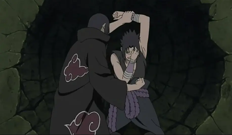 Sasuke intento atacarlo por lo que despierta su Sharingan por primera vez, pero Itachi logro esquivar sus ataques. Cuando Itachi estaba recogiendo su Banda Ninja la cual se le había caído, él derrama una lágrima frente a su hermano. Luego procedió a incapacitar a Sasuke, quien despertó en el hospital recordando todo lo que quería que él hiciera. Desde ese momento Sasuke juro vengarse de él y poder re-establecer la gloria del Clan Uchiha. Itachi dejó el pueblo como un traidor. Según Tobi, Itachi también tenía una novia, a quien mató durante la Masacre del Clan Uchiha.