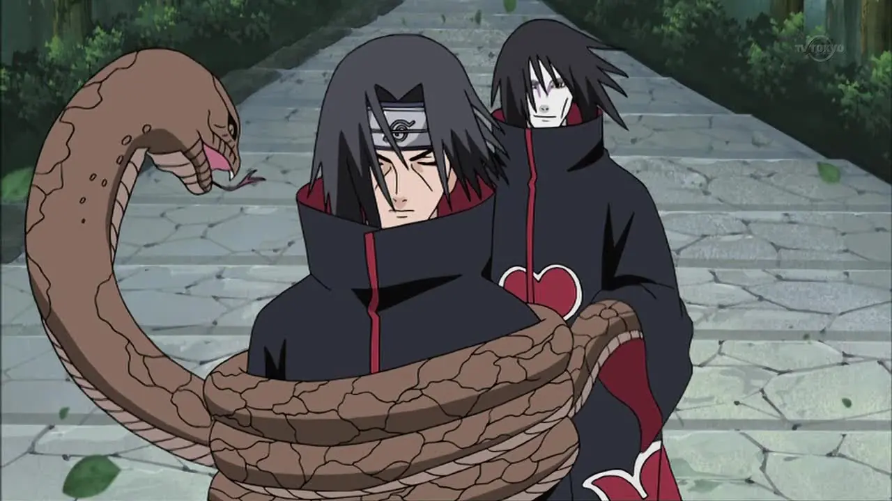 En ese instante Sasuke debilitado y sin chakra libera a Orochimaru que crea una serpiente blanca de 8 cabezas que lucha contra el Susanō de Itachi, tras varias cabezas derrotadas Orochimaru emerge de una de las cabezas y grita riendo "Que es libre y que por fin se apoderara de el cuerpo de Sasuke" Tras oír eso Itachi hace una expresión de enfado y éste lo ataco con su Espada Totsuka que puede sellar lo que corta en un mundo de genjutsu eterno con la cual sella los poderes de la serpiente blanca y Orochimaru.