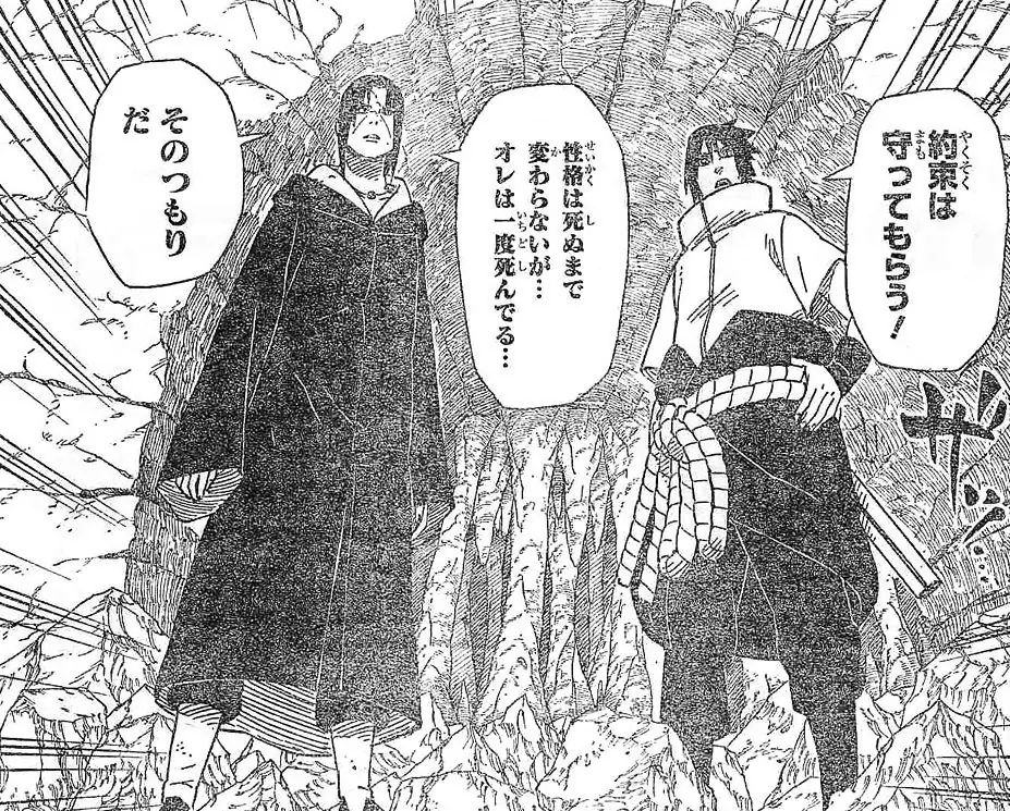 Parte de la discusión que tuvo con Naruto tras derrotar a Nagato, y la charla que sostuvo con Sasuke antes de desaparecer coinciden en que ambos podrían hacer un cambio importante: Naruto sería capaz de cambiar/salvar a Sasuke y al mundo, mientras que Sasuke podría cambiar a sus padres y al mismo Clan Uchiha. Los dos siendo los personajes principales de la historia.