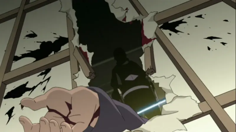 La copia de Itachi atacando al Equipo Kakashi y Chiyo.