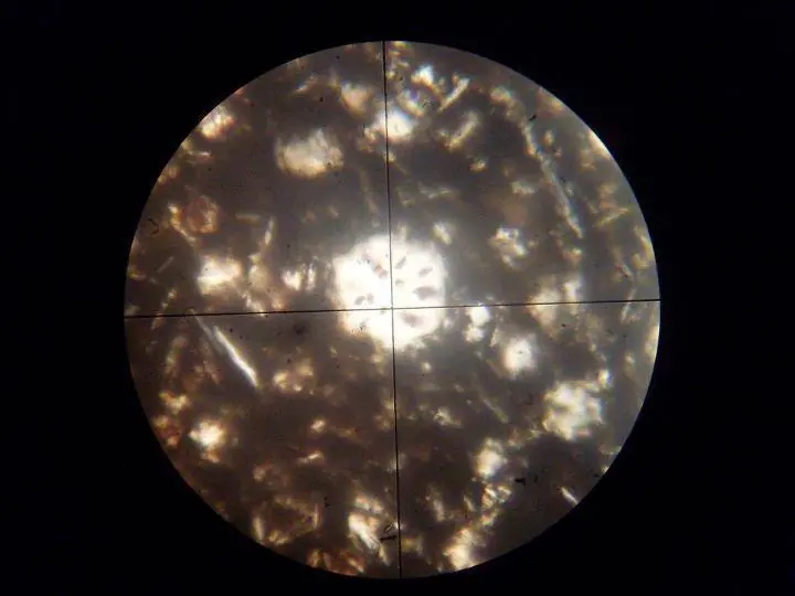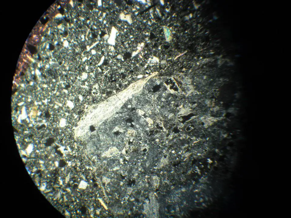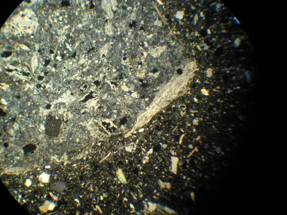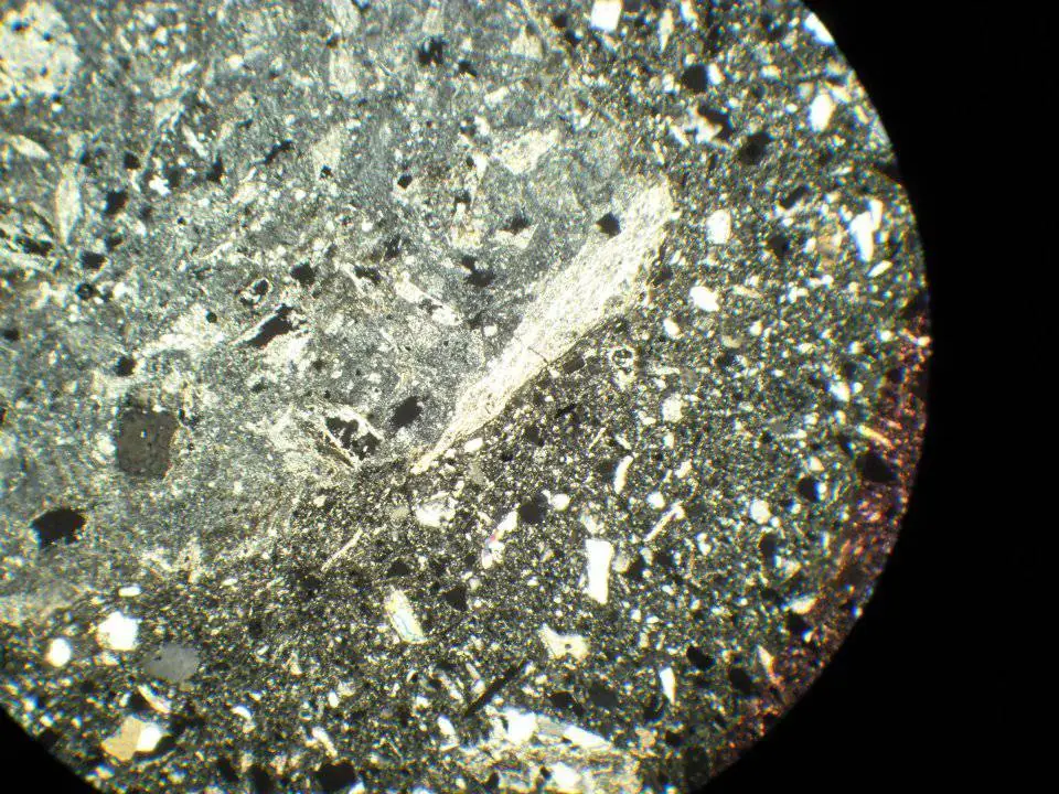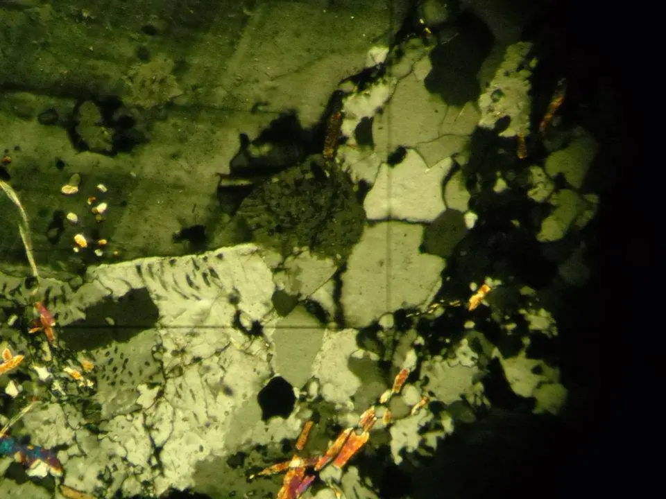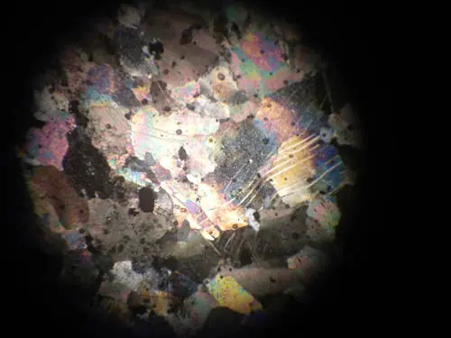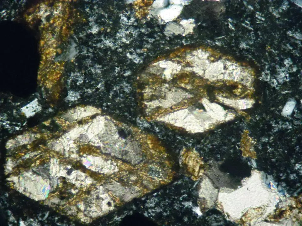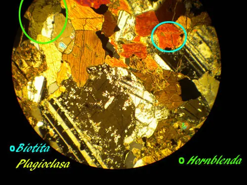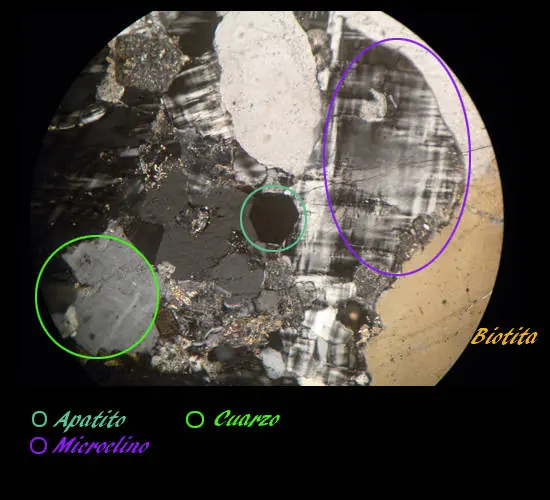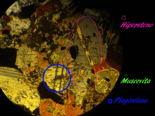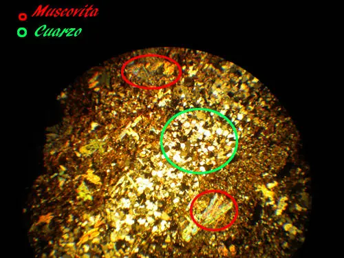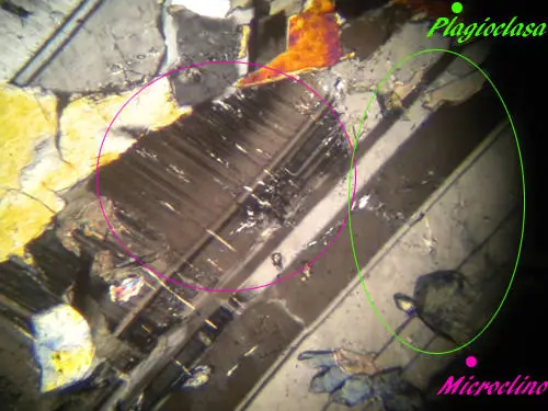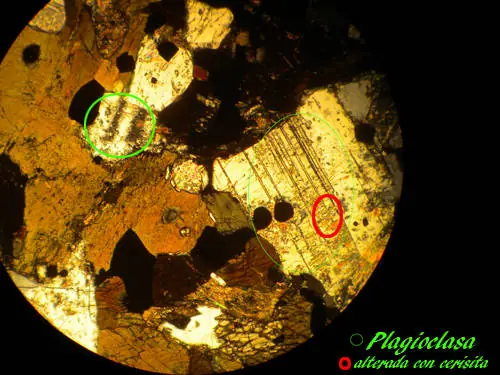 En estas fotos, podemos apreciar, los cristales tabulares de plagioclasa, maclados polisintéticamente (esa seguidilla de blancos y negros a la izquierda de la primera foto), El cuarzo que es incoloro (se ven grises los cristales) y la foto está centrado en un mineral de alteración llamado Cerisita que altera a las plagioclasas (eso que parecen puntitos blancos sobre un fondo negro y en algunas partes multicolores). La sericita se ve especialmente bien en la cuarta foto.