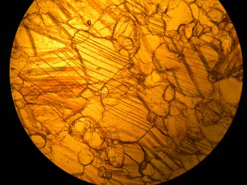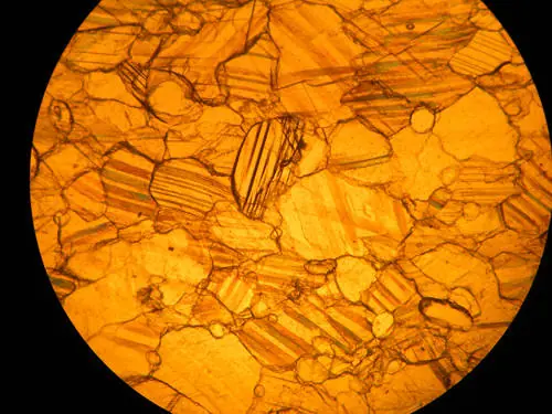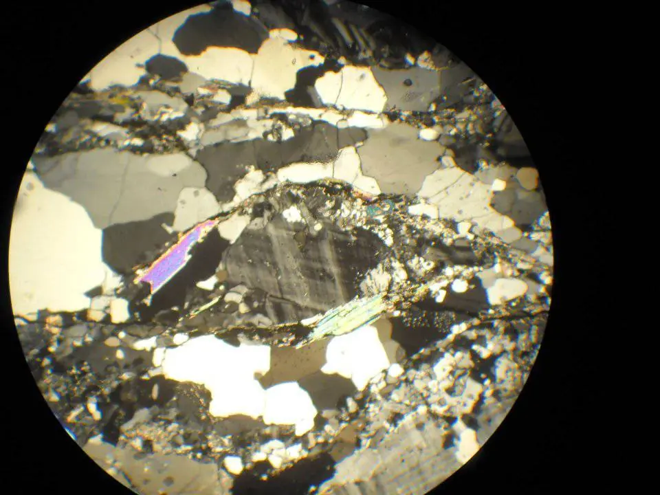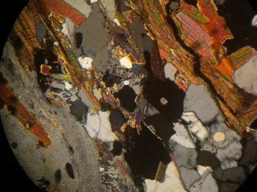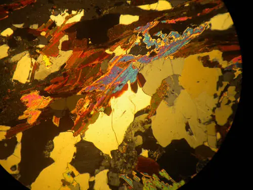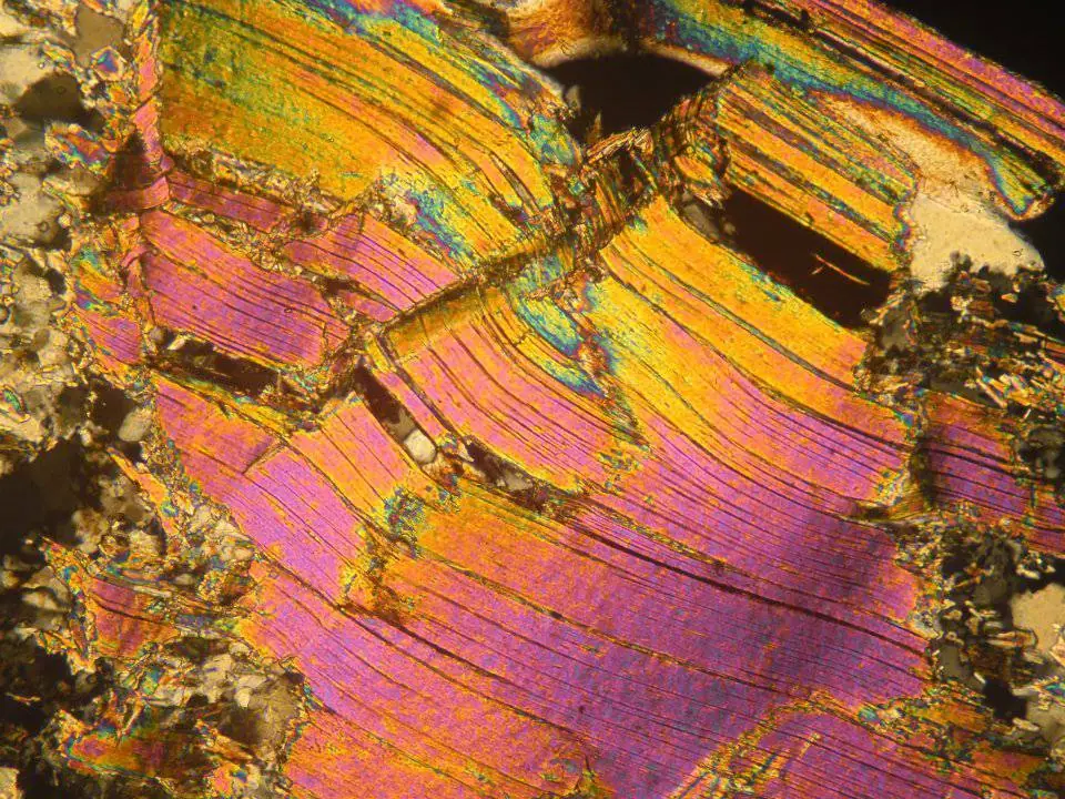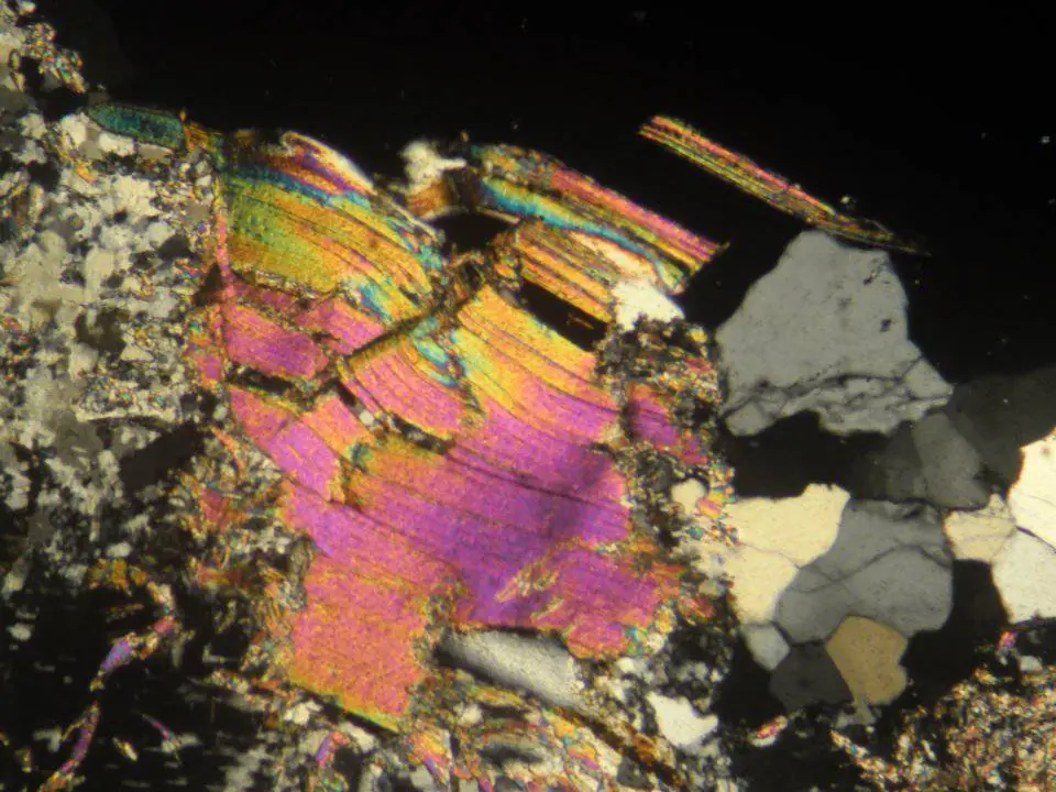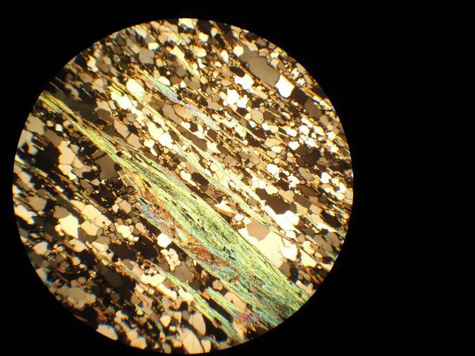 En las siguientes fotos podemos ver: una secuencia de 3 fotos con cristales que están siendo alterados por Calcita, luego una secuencia de 3 fotos con la misma muestra pero con menos zoom óptico, luego 4 fotos con un Microclino que se formó por la intensa presión, y luego 3 que muestran una Muscovita plegada por la presión.