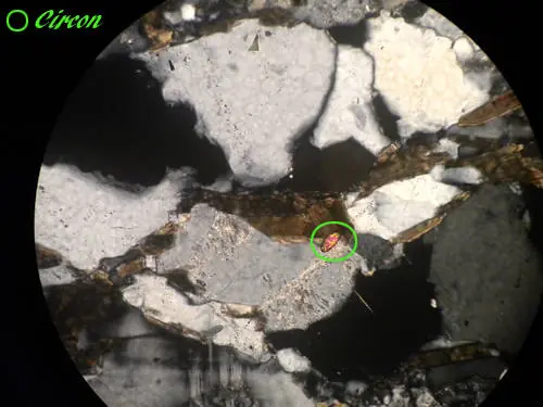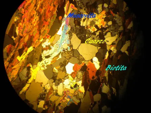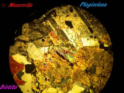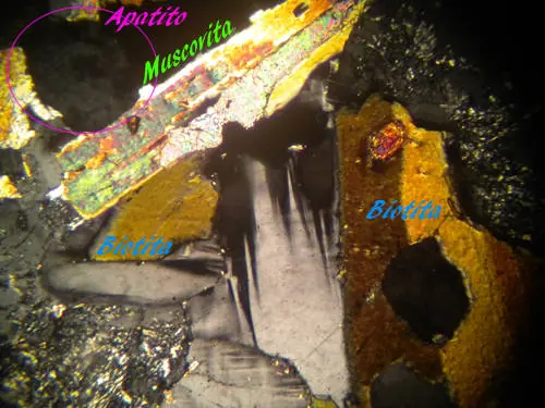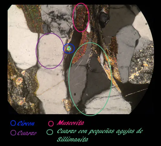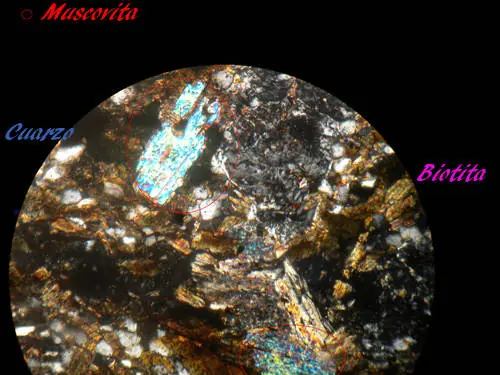 Muestra 3: En esta roca los siguientes minerales están presentes: Biotita, Muscovita, Cuarzo, Plagioclasa, Apatito, Circon, Microclino, Cerisita, y también hay algunas agujas de Sillimanita en Cuarzos y Muscovita. El tamaño del grano es grueso, y la textura es granoblástica.