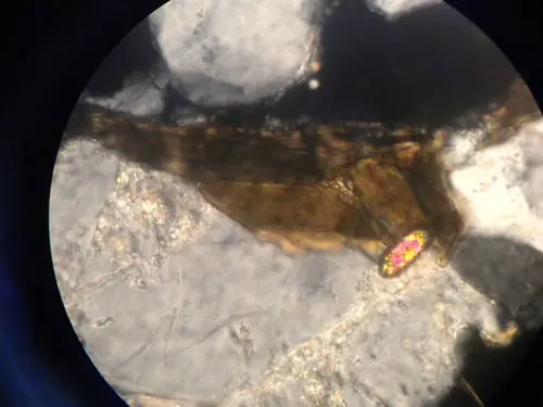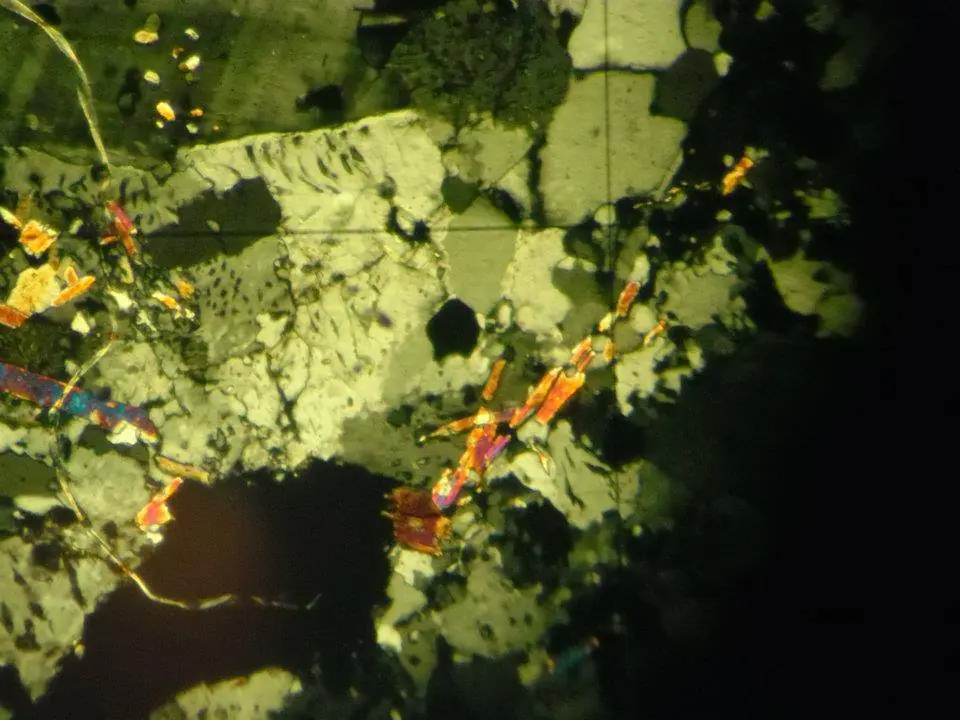 Estas fotos, son como algunas anteriores, la misma sección de los minerales, pero tomadas con diferente aumento del microscopio y con luz polarizada y analizadores intercalados, y estas muestran la alteración de la biotita (el pequeño cristal color pardo) por la clorita, el mineral verde que lo envuelve.