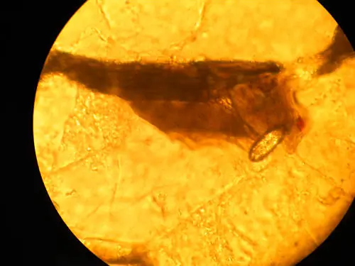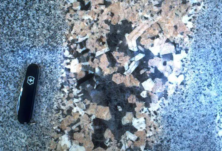 Esta foto muestra un pequeño cristal de Apatito, envuelto en mineral llamado Ortosa, que es bastante común encontrar de forma pertitizada (como la que se ve en la foto), esas “venillas” que se observan son producto de un proceso llamado desmezcla entre la ortosa y la plagioclasa.