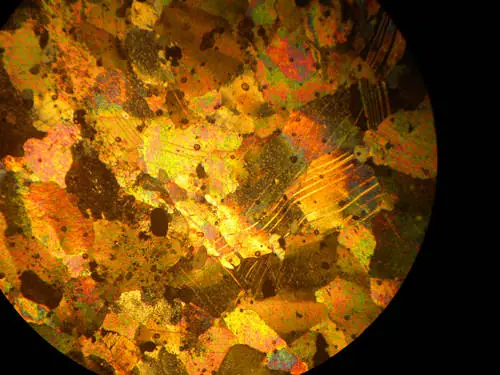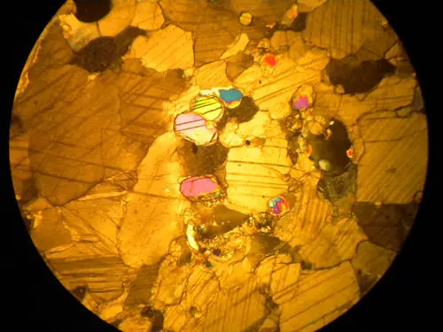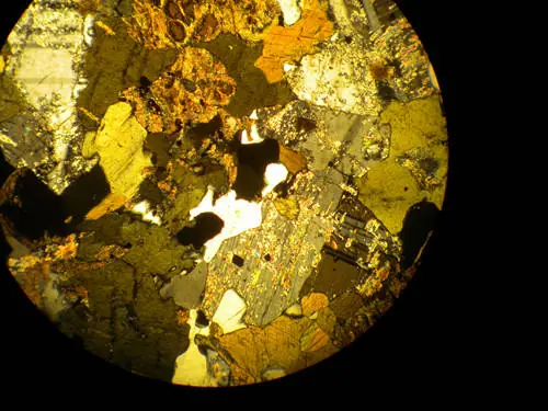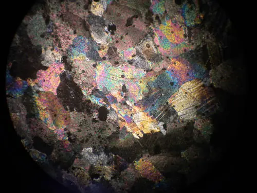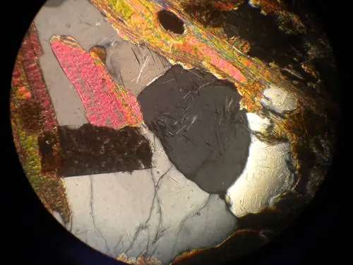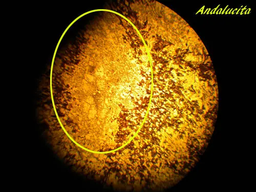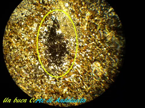 Esta secuencia de fotos, muestra como varia la coloración de los minerales si estos son vistos con luz polarizada o con analizadores intercalados.