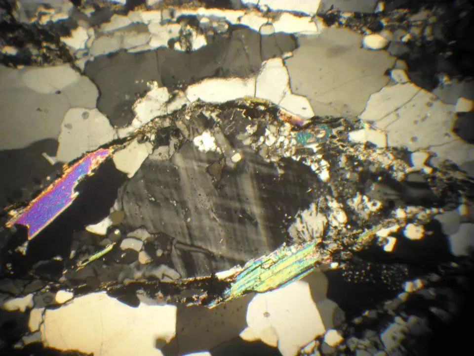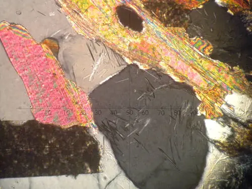 En esta foto, podemos apreciar: Augita (el mineral azul), Hipersteno (lo que está adentro de la Augita), y también podemos ver un cristal de Cuarzo a la izquierda de la Augita. Para esta foto, el microscopio estaba trabajando con analizadores intercalados.