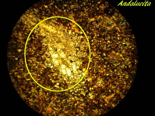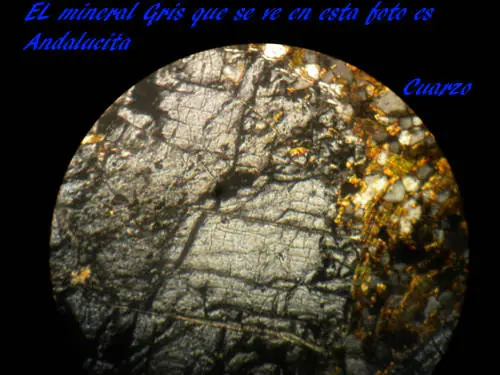 Muestra 1: En esta muestra tenemos: Cuarzo, Muscovita y Biotita y Andalucita la textura de esta roca es granoblástica y se genero por un metamorfismo de contacto. La roca a partir la cual se genero es una Pelita (roca sedimentaria de grano fino).