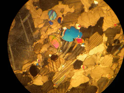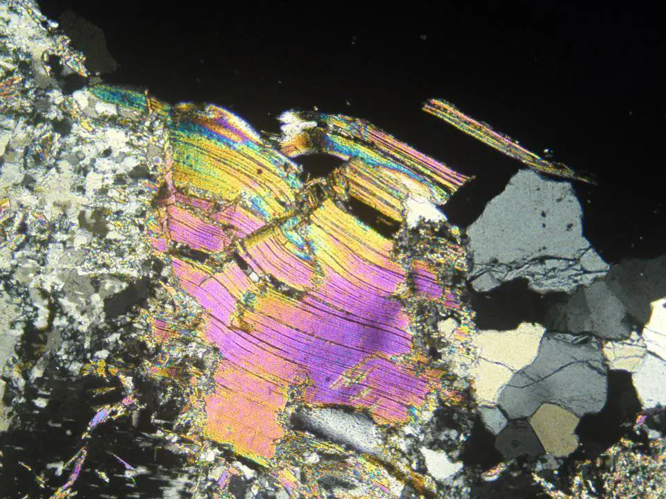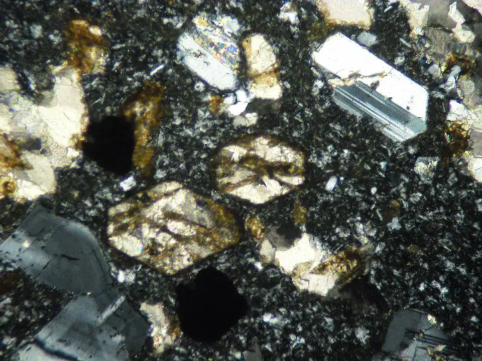 En esta vemos: Plagioclasa (el mineral que tiene secuencias de blanco y negro, lo cual se debe a su maclado polisintético), cristales varios de augita de colores azules, verdes, amarillos y naranjas (varían su color por el corte de la sección delgada).Aquí también se trabajo con analizadores intercalados.