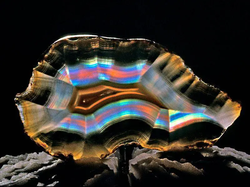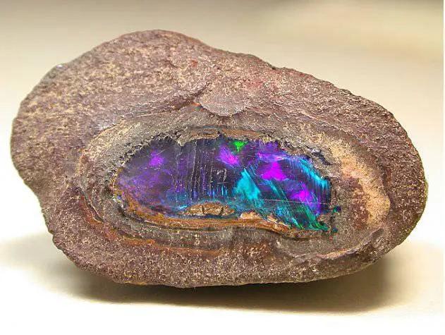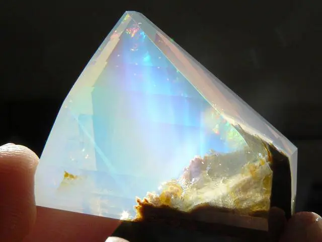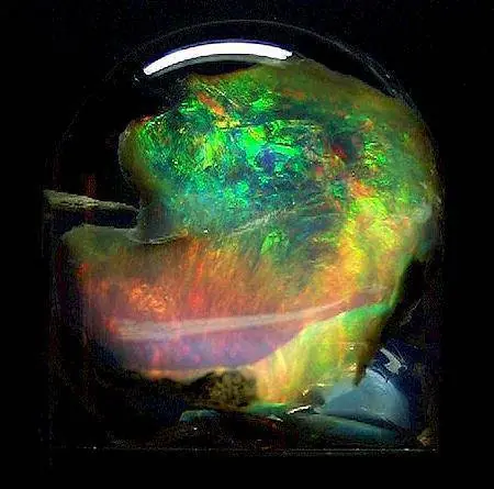 Estos Ópalos llamados "Ópalos de relámpago" son parecidos a los "Ópalos de fuego" salvo por su coloración, el efecto iridiscente se debe a micro fracturas en la estructura interna del mineral, ambas muestras provienen de Australia. Para más información ver "fuegos internos"