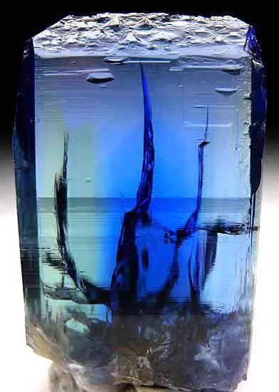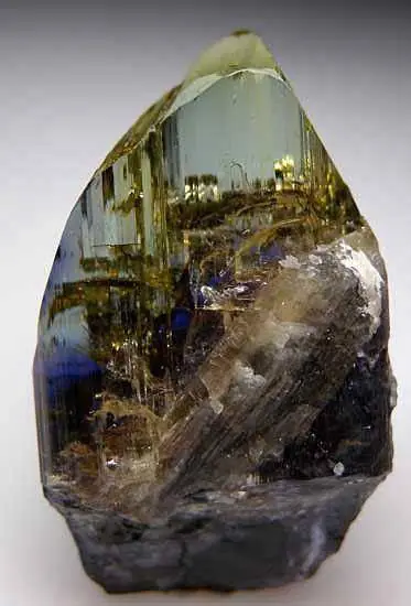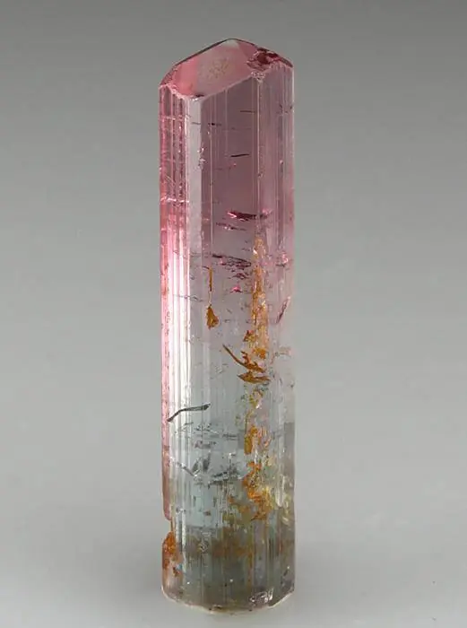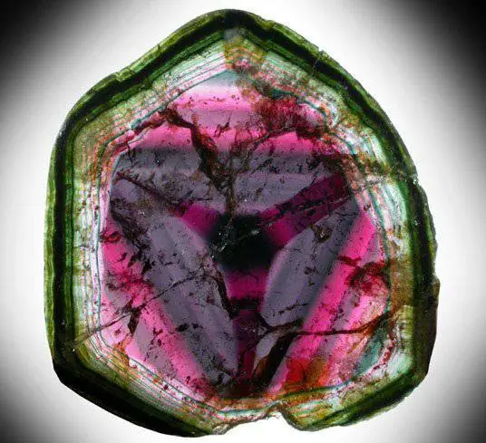 Una "rebanada" de un cristal de Turmalina, que muestra zonación interna de colores. La segunda foto es la de un cristal de Turmalina entero.