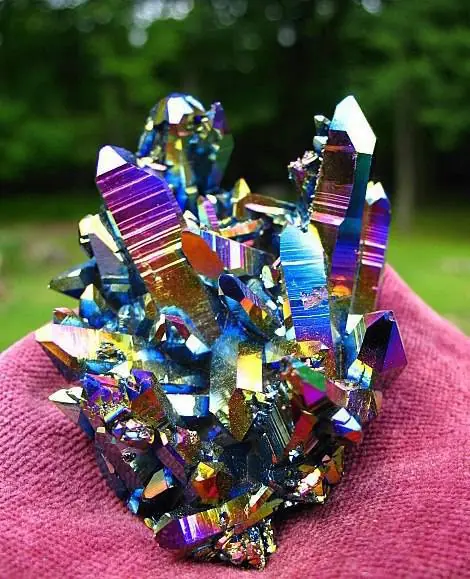 Estos cristales de Cuarzo deben su hermosa e iridiscente coloración a inclusiones de Titanio en su estructura cristalina