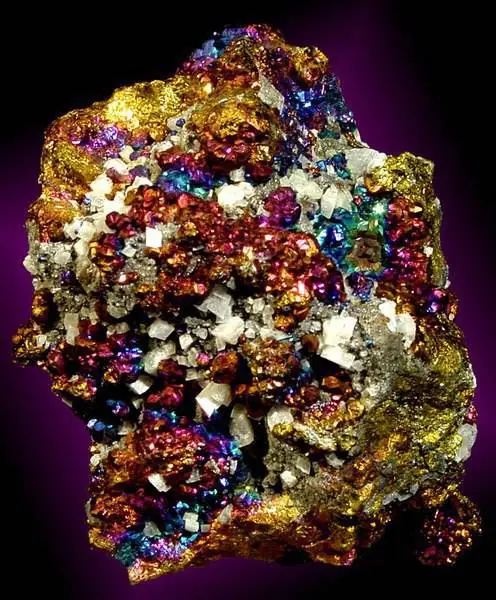 La Calcopirita es el mineral más comun del Cobre y es a su vez la mena más importante de este elemento,tiene este nombre porque tiene el mismo color que la Pirita. La superficie de este mineral generalmente se encuentra barnizada con capas iridicentes de color verde, purpura y azul.