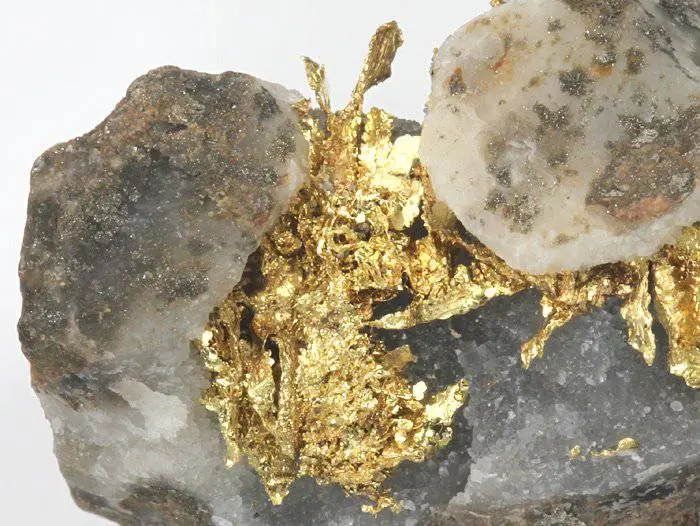 Oro nativo y cuarzo, la palabra "nativo" hace referencia a que en la naturaleza es encontrado puro, no se agrupa con ningún otro elemento químico (excepto con la plata que raramente pueden formar una aleación llamada "Electrum". Otros elementos que se pueden encontrar en estado nativo son: la plata, el grafito y su polimorfo el diamante (ambos minerales están formados enteramente por el elemento Carbono).