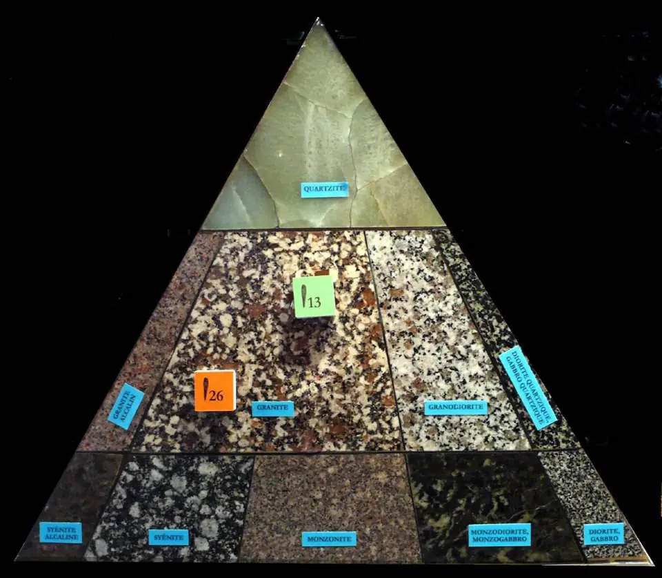Un triangulo APQ (Cuarzo en el vértice superior, feldespato potásico en el vértice izquierdo y Plagioclasa en el vértice derecho), sirve para clasificar a las rocas ígneas, en este caso las rocas plutónicas, negus las proporciones de cada mineral.