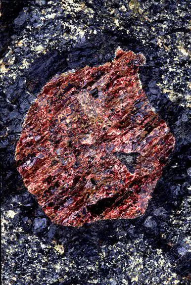 En esta foto, apreciamos casi los mismos minerales anteriores con la adición de Titanita, un mineral accesorio, que en la foto esta casi perfectamente formado (es el mineral de aspecto rómbico alargado)