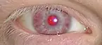 El albinismo es una condición genética que afecta a los animales, cuya principal característica es la ausencia congénita de melanina en ojos, piel y pelos. Es así como en estos casos el color de ojos depende del grado de albinismo que posee el paciente. De esta forma, en los casos de leve albinismo oculacutáneo, los afectados poseen generalmente ojos de color azul y gris, o bien café en razas oscuras, lo que es un indicio de poseer cantidades de melanina en el iris que bloqueen la luz. Sin embargo, en los casos severos de albinismo oculacutáneo no existe melanina en el iris, por lo que la luz puede pasar a través de éste, siendo que en un ojo normal la luz entra en el ojo sólo a través de la pupila. Esto genera el reflejo de la hemoglobina de los vasos sanguíneos de la retina, lo que provoca a su vez el aspecto de ojos color violeta o incluso rojo en el afectado. Los pacientes con albinismo padecen comúnmente de fotofobia, nistagmo, estrabismo, miopía y astigmatismo, producto de la insuficiente cantidad de melanina en los ojos.
